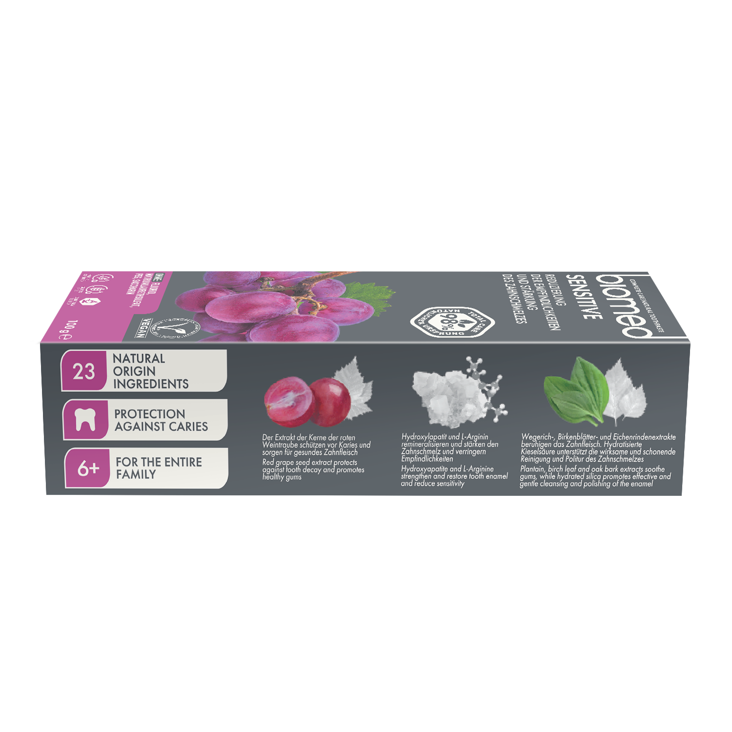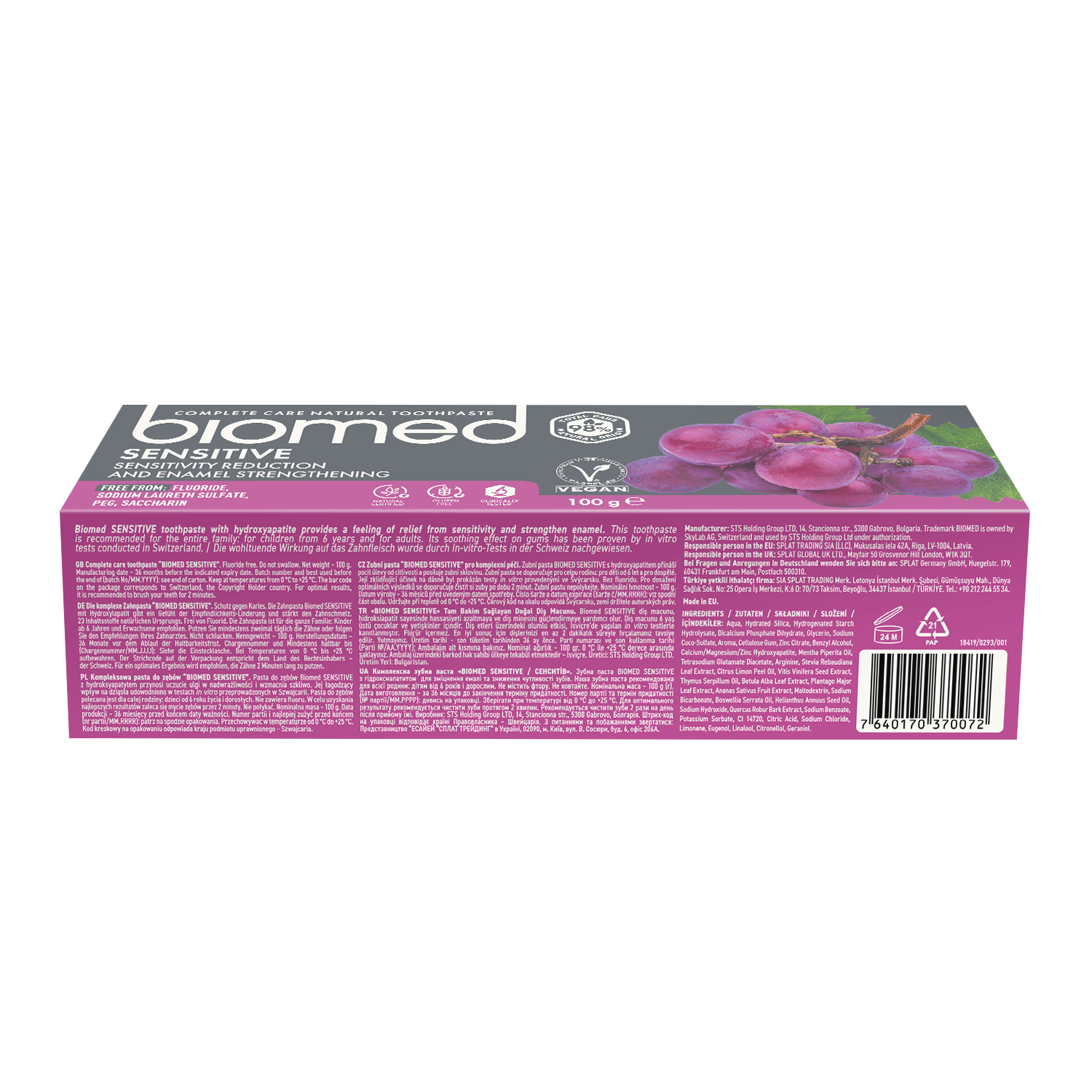 Revitalizante Biomed® SENSITIVE pasta de dientes con hidroxiapatita de calcio para fortalecer el esmalte y aliviar los dientes sensibles. ¡De ahora en adelante, tus dientes no tienen nada que temer! – 30 segundos para limpiar los dientes; – 12 horas de efecto de limpieza; – 99% Natural; – 15 ingredientes naturales clave.