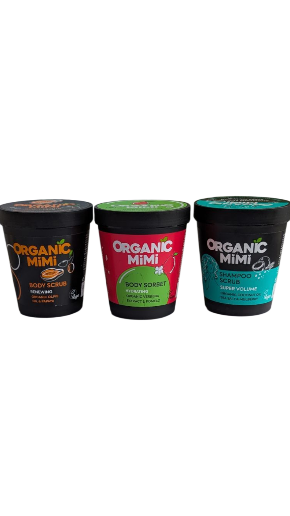 Organic MiMi Champu Exfoliante Super Volumen Sal Marina y Morera Organic MiMi Exfoliante Corporal Renovador Olivo y Papaya Organic MiMi Sorbete Corporal Verbena y Pomelo