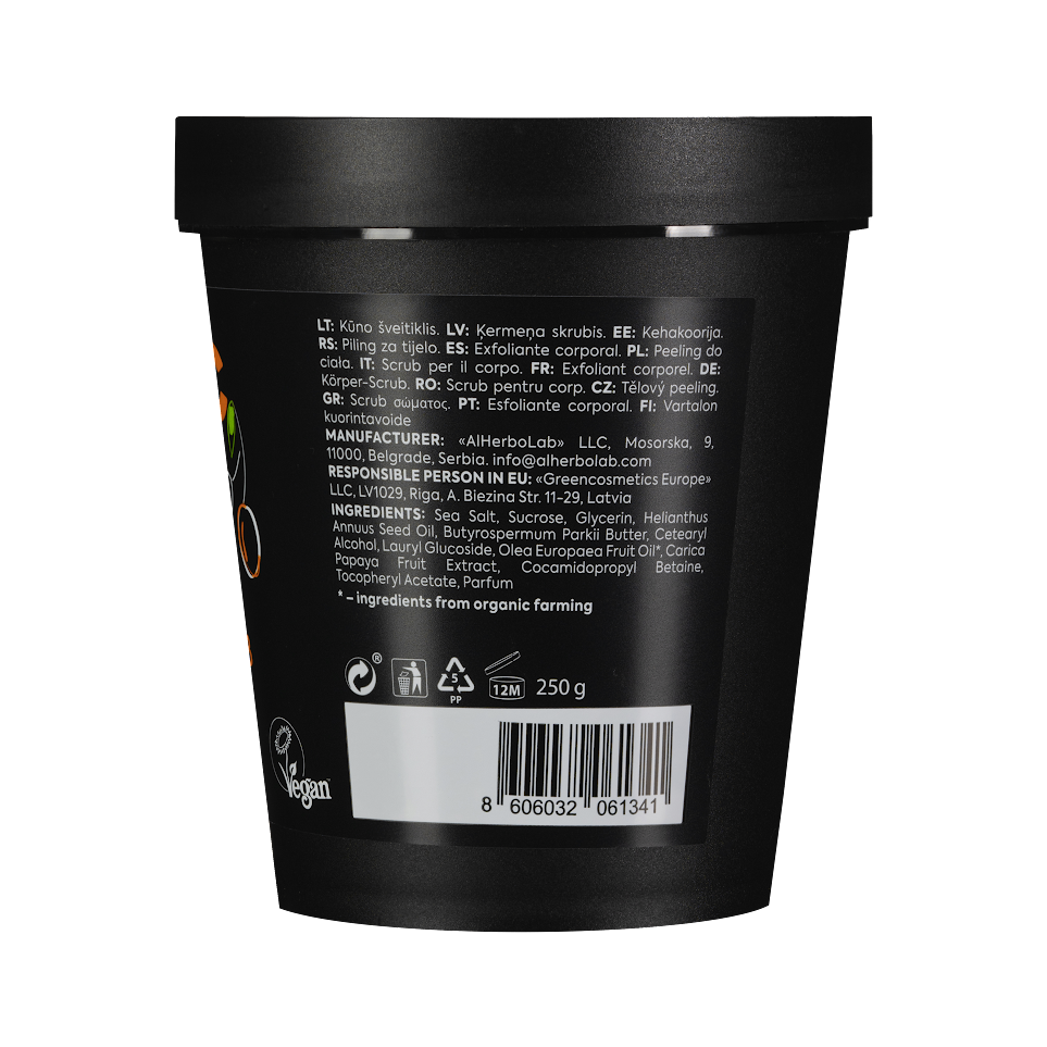 Este exfoliante a base de azúcar y sal marina limpia y exfolia la piel en profundidad, le devuelve su elasticidad y firmeza, aportándole un delicioso brillo saludable y suavidad.
