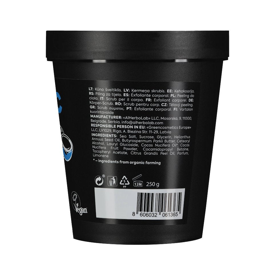 Sal marina, sacarosa, glicerina, aceite de semillas de Helianthus Annuus, manteca de Butyrospermum Parkii, alcohol cetearílico, lauril glucósido, aceite de Cocos Nusifera*, polvo de frutos de Cocos Nucifera, cocamidopropil betaína, acetato de tocoferilo, aceite de cáscara de Citrus Grandis, parfum, limoneno.