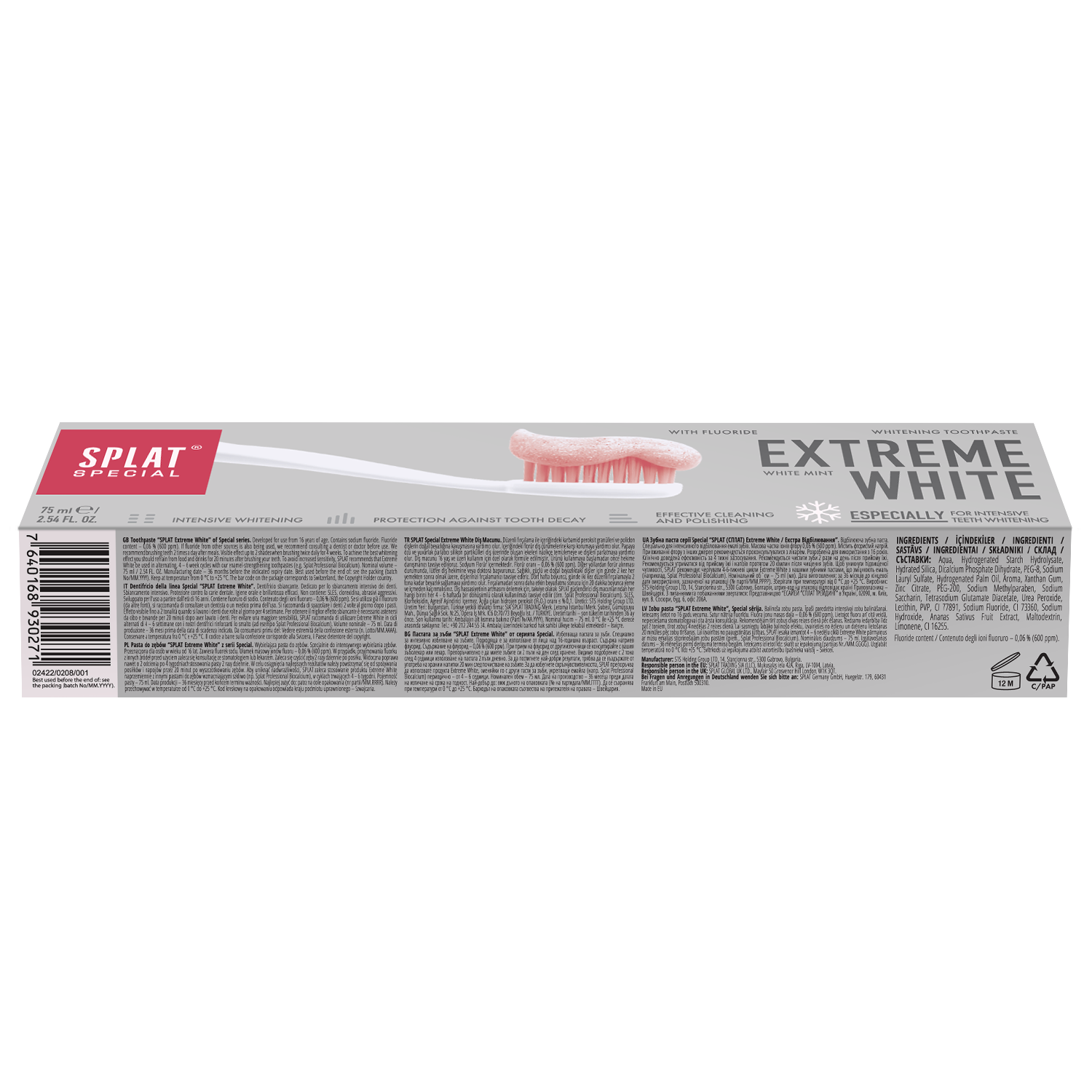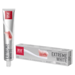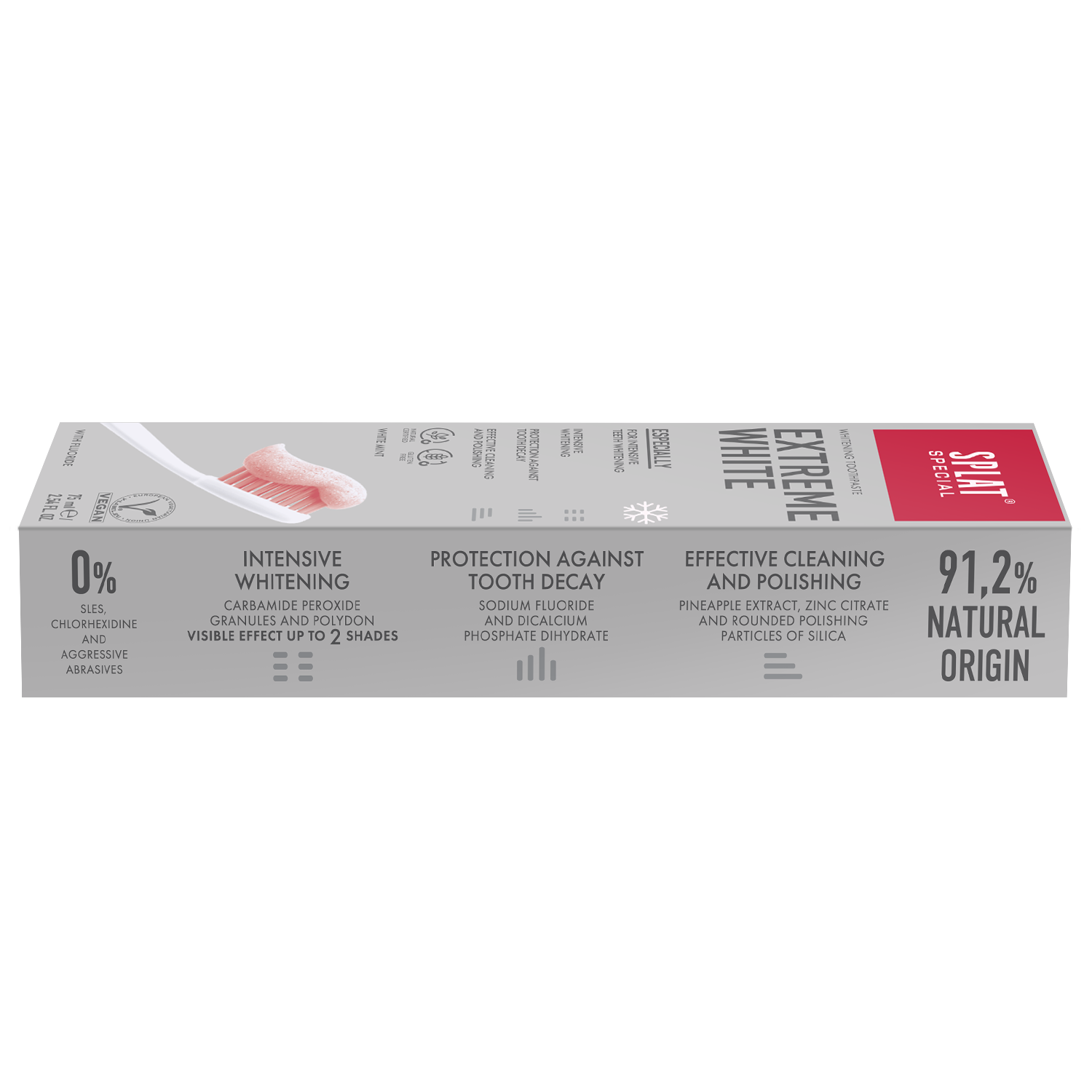 EXTREME WHITE contiene microgránulos con peróxido de carbamida y povidona que blanquean suavemente el esmalte hasta 2 tonos en solo 4-6 semanas de uso diario. La combinación de enzimas naturales y partículas de pulido redondeadas permite eliminar las manchas superficiales y la placa dental. Los iones de fluoruro protegen de forma fiable contra la caries dental. Desarrollado para su uso a partir de los 16 años de edad.
