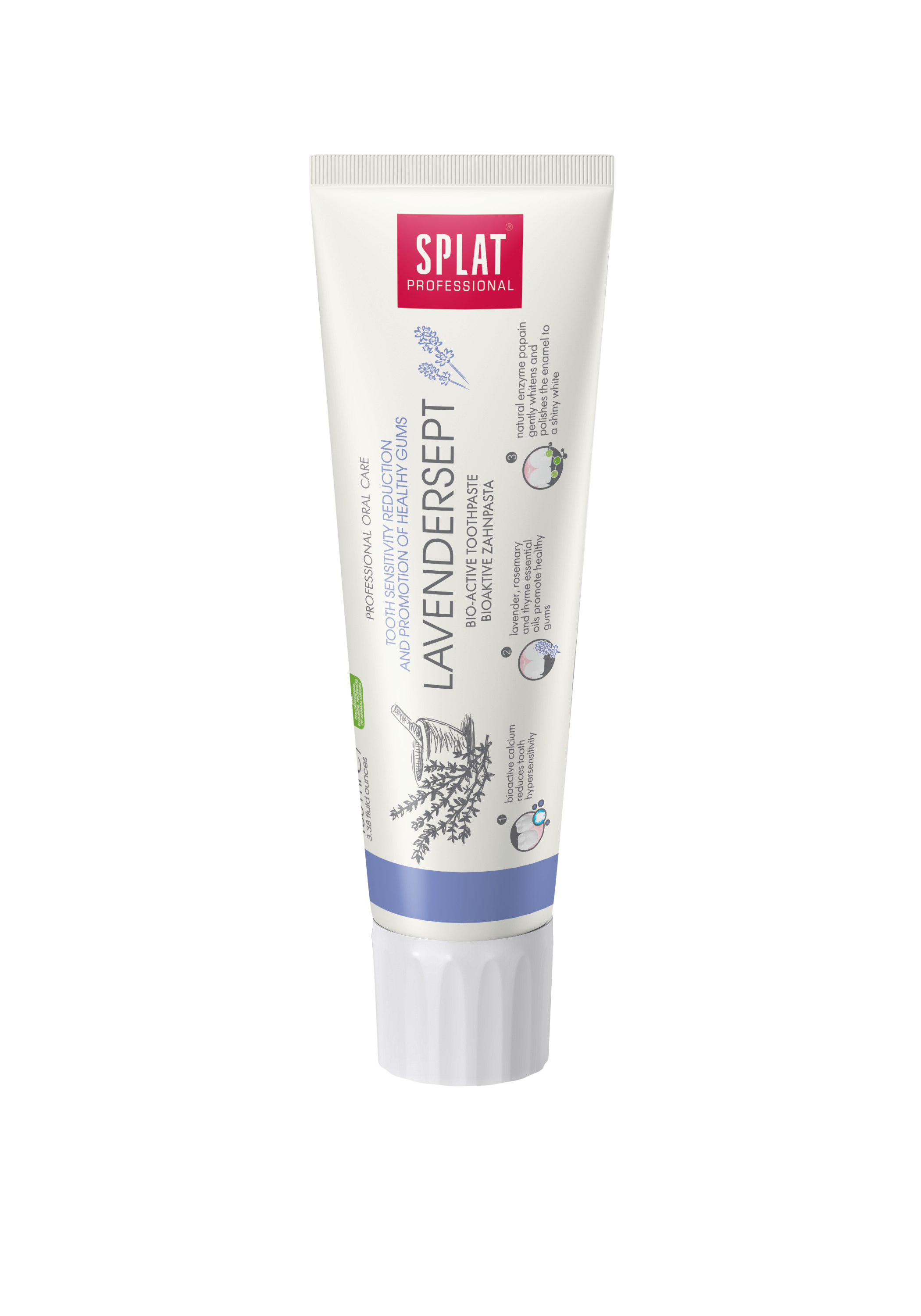 La pasta de dientes eficaz para el cuidado total con aceites esenciales de lavanda, romero y tomillo mantiene sanas las encías. La enzima natural papaina blanquea suavemente el esmalte, dejándolo perfectamente limpio y suave. El fosfato de calcio reduce la hipersensibilidad dental. .