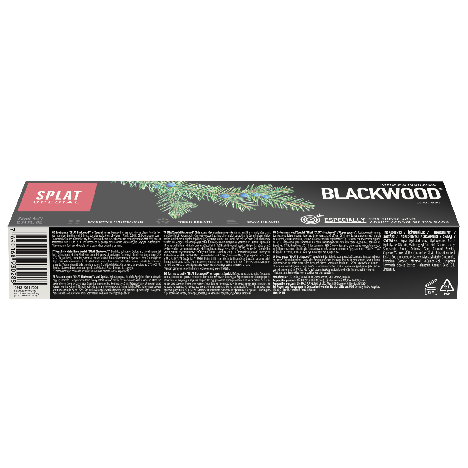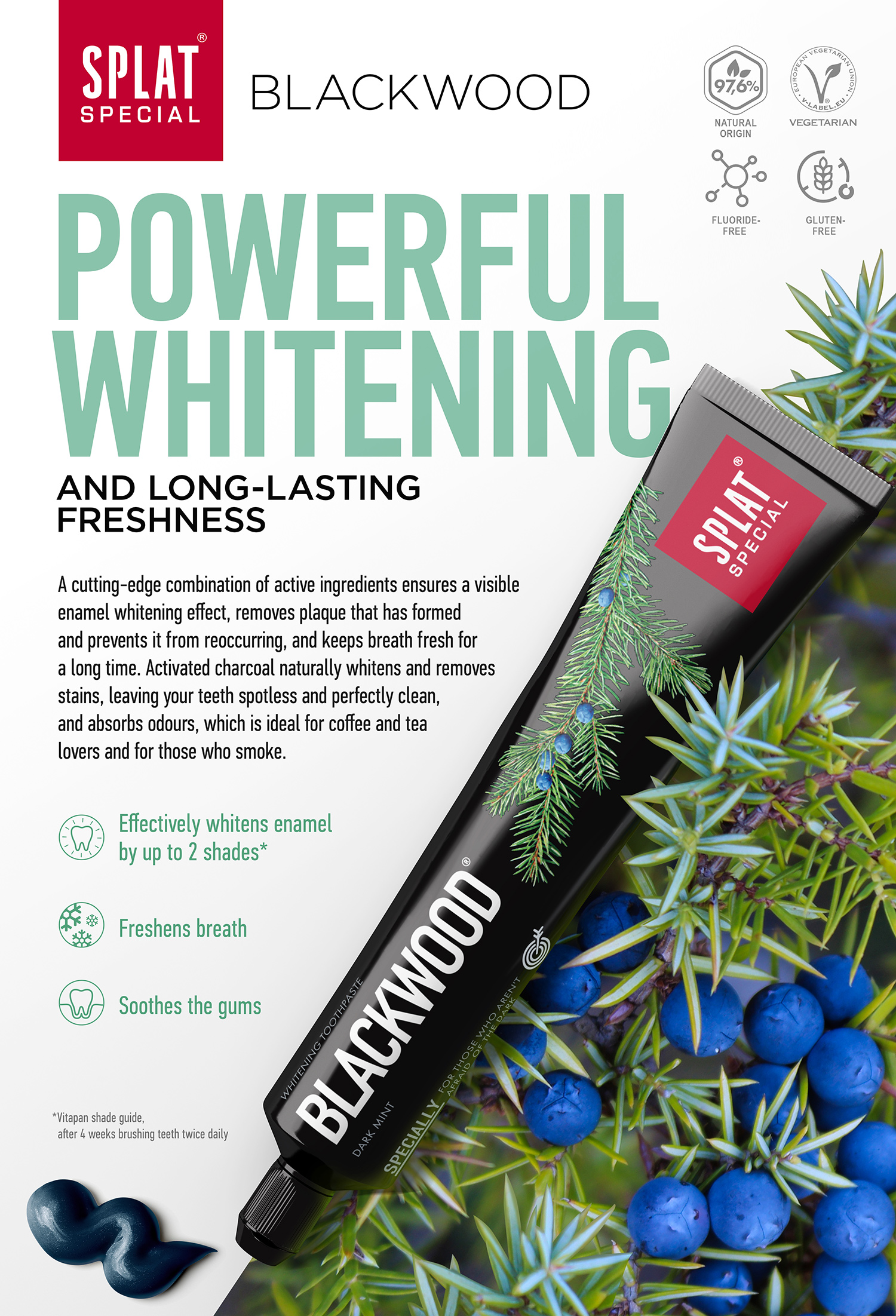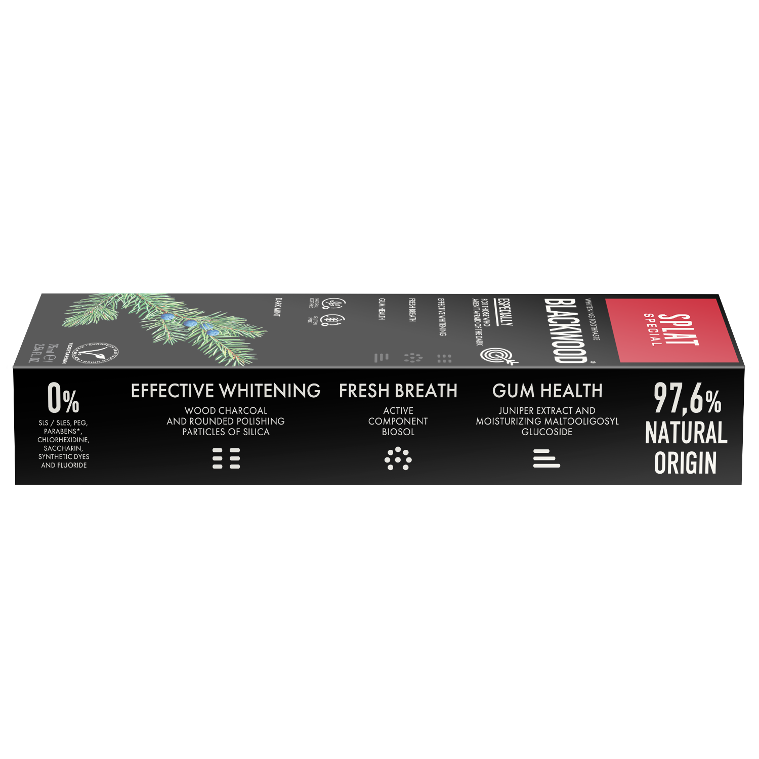 BLACKWOOD® su color negro, naturalmente blanquea, absorbe los olores y elimina las manchas, dejando sus dientes impecables y perfectamente limpios. Extracto de bayas de enebro, un ingrediente antibacterian activo , te deja con un aliento fresco durante más tiempo después del cepillado.